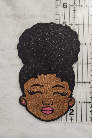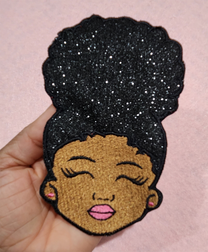 Say hello to Puff Princess—a joyful embroidered character patch featuring a Black girl with a glitter puff bun, sweet closed-eye smile, and pink details.